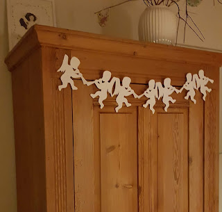 Jeg har lavet remser til at ligge på bordet i juledagene, men remsen er også fin at hænge på væggen eller på kommoden eller et skab eller hvor man nu har lyst til at hænge en række trompet truttende engle.